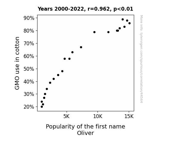 This means 92.6% of the change in the one variable (i.e., Popularity of the first name Oliver) is predictable based on the change in the other (i.e., GMO use in cotton) over the 23 years from 2000 through 2022.