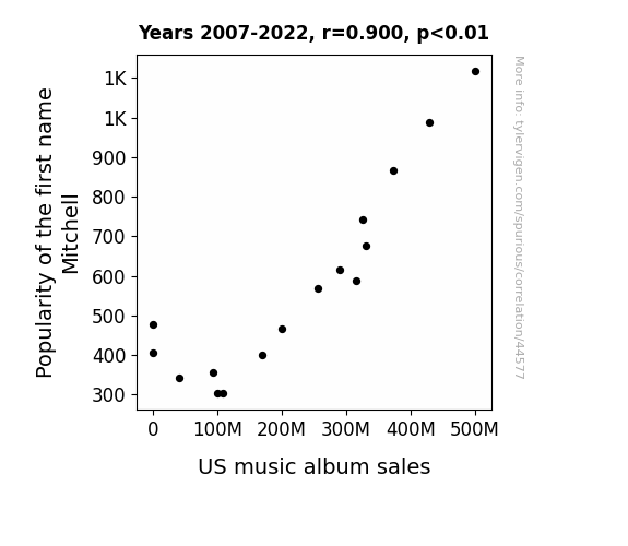 This means 81.1% of the change in the one variable (i.e., US music album sales) is predictable based on the change in the other (i.e., Popularity of the first name Mitchell) over the 16 years from 2007 through 2022.