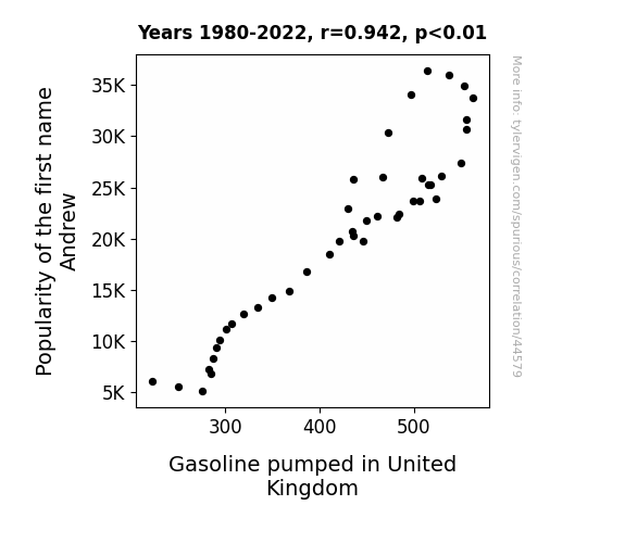 This means 88.7% of the change in the one variable (i.e., Gasoline pumped in United Kingdom) is predictable based on the change in the other (i.e., Popularity of the first name Andrew) over the 43 years from 1980 through 2022.