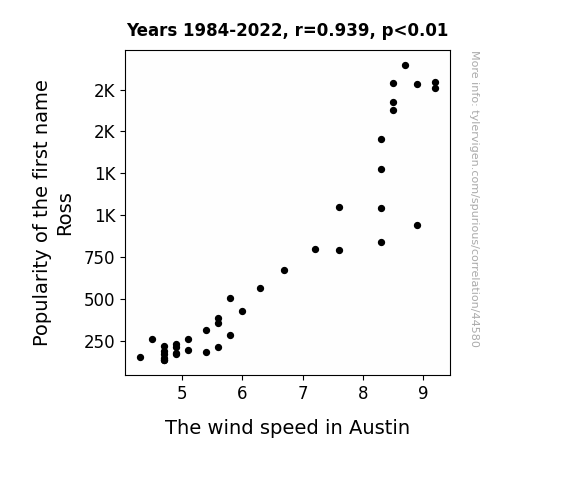 This means 88.2% of the change in the one variable (i.e., The wind speed in Austin) is predictable based on the change in the other (i.e., Popularity of the first name Ross) over the 39 years from 1984 through 2022.