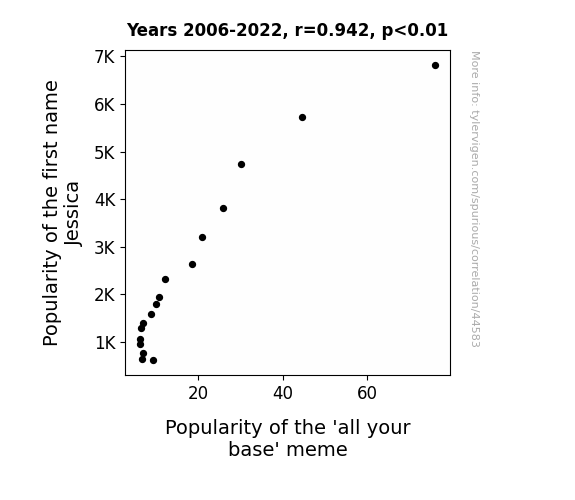 This means 88.8% of the change in the one variable (i.e., Popularity of the 'all your base' meme) is predictable based on the change in the other (i.e., Popularity of the first name Jessica) over the 17 years from 2006 through 2022.