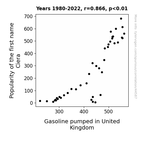 This means 75% of the change in the one variable (i.e., Gasoline pumped in United Kingdom) is predictable based on the change in the other (i.e., Popularity of the first name Ciera) over the 43 years from 1980 through 2022.