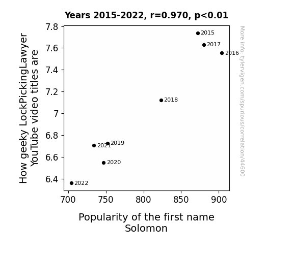 This means 94.1% of the change in the one variable (i.e., Popularity of the first name Solomon) is predictable based on the change in the other (i.e., How geeky LockPickingLawyer YouTube video titles are) over the 8 years from 2015 through 2022.