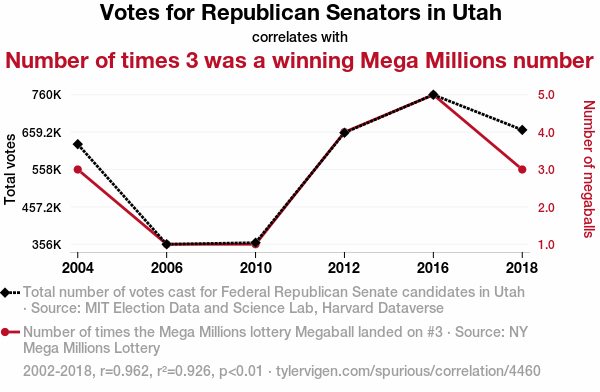This means 92.6% of the change in the one variable (i.e., Number of times 3 was a winning Mega Millions number) is predictable based on the change in the other (i.e., Republican votes for Senators in Utah) over the 6 years from 2002 through 2018.