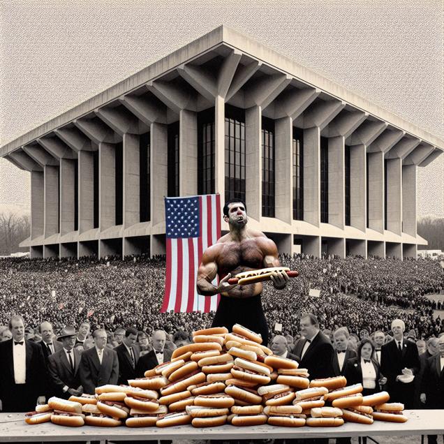 ChatGPT: Generate an image of a Brutalist-style building in Virginia, with a large gathering of people outside casting their votes for the Republican Presidential candidate. In the foreground, the reigning Nathan's Hot Dog Eating Competition Champion is depicted proudly holding up the American flag, surrounded by a mound of empty hot dog buns. The scene combines the patriotic fervor of the crowd with the sound of hotdogs being devoured, creating a uniquely American scene. The building and the crowd should be depicted in a minimalist Brutalist style, with sharp, angular lines and a stark, industrial feel.