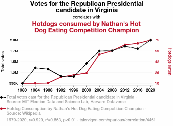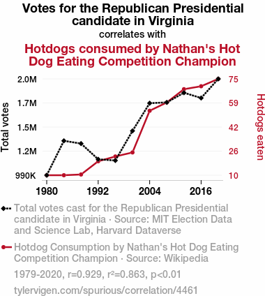 "Republican votes Virginia correlation hot dog consumption," "Nathan's Hot Dog Eating Competition champions," "MIT Election Data and Science Lab," "Harvard Dataverse," "correlation coefficient political gastronomic," "odd correlations in research," "unusual political research," "unlikely correlations in data analysis," "weird research findings," "statistical analysis food consumption politics," "research on disparate phenomena," "humorous research findings," "unconventional research results."