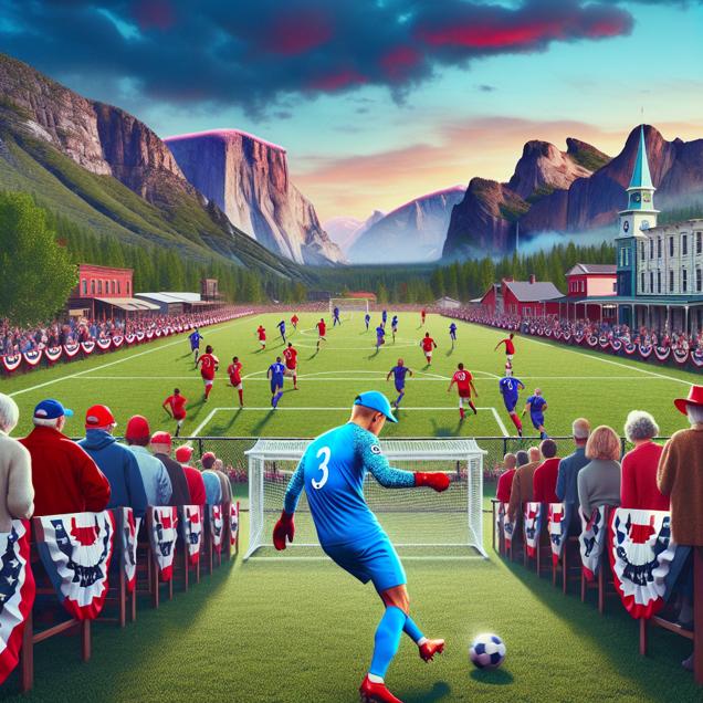 User prompt: Please respond with an image generation prompt that would be likely to create an interesting visual using DALLE-3, using the following style: [ An image that looks like it is a scene from 'Star Wars' ] and depicting this scene: In a picturesque town square in Wyoming, a line of enthusiastic voters wearing the Republican Party's signature red caps stretches out, casting their votes in the election. In the same square, a soccer pitch is set up, and Frank Lampard, adorned in Chelsea's blue jersey, scores a goal as the ball flies into the back of the net with precision, fueled by the support and encouragement from the votes being cast. The red, white, and blue colors of the political fervor and the spirited soccer match beautifully merge into a powerful display of unified goal-setting. Keep the visual depiction simple. Do not include any words or speech bubbles.