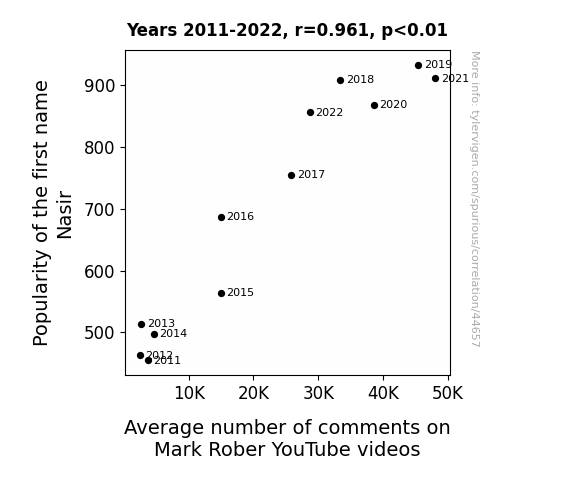 This means 92.4% of the change in the one variable (i.e., Average number of comments on Mark Rober YouTube videos) is predictable based on the change in the other (i.e., Popularity of the first name Nasir) over the 12 years from 2011 through 2022.