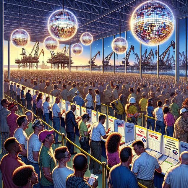 Prompt: Generate an image of a bustling New Jersey polling station with a long line of voters snaking through the space. People are casting their ballots for the Democrat Presidential candidate. In the center of the image, shimmering disco balls materialize above the crowd, filling the room with a dazzling spectacle. Meanwhile, transition to Brunei, depicting a group of oil rig workers taking a break from their duties and breaking into spontaneous dance. Their movements cause a noticeable increase in petroleum consumption. The depiction should include only scenes, people, and objects, it should not include text or speech bubbles.