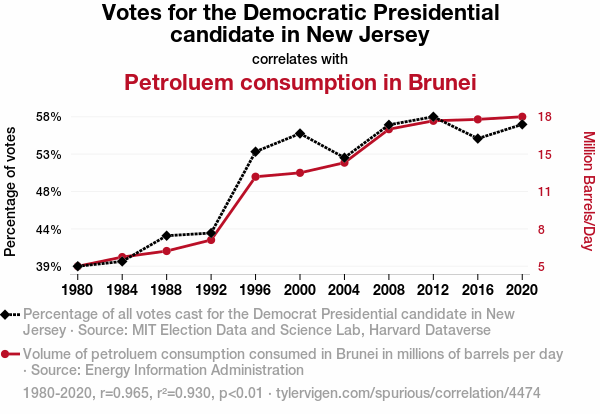This means 93% of the change in the one variable (i.e., Petroluem consumption in Brunei) is predictable based on the change in the other (i.e., Votes for the Democrat Presidential candidate in New Jersey) over the 11 years from 1980 through 2020.