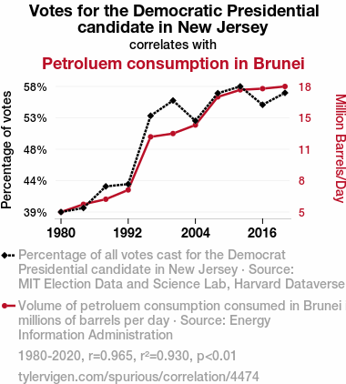 - The spurious research paper: Blue Wave and Black Gold: Investigating the Surprising Link Between Democratic Votes in New Jersey and Petroleum Consumption in Brunei
