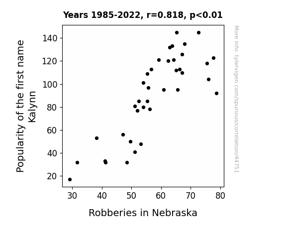 This means 67% of the change in the one variable (i.e., Robberies in Nebraska) is predictable based on the change in the other (i.e., Popularity of the first name Kalynn) over the 38 years from 1985 through 2022.