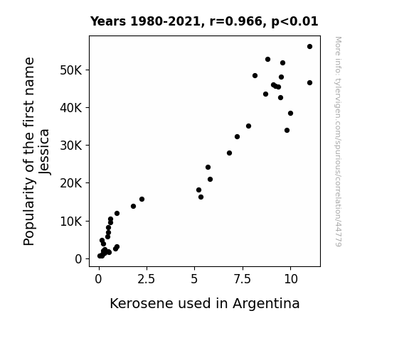 This means 93.4% of the change in the one variable (i.e., Kerosene used in Argentina) is predictable based on the change in the other (i.e., Popularity of the first name Jessica) over the 42 years from 1980 through 2021.