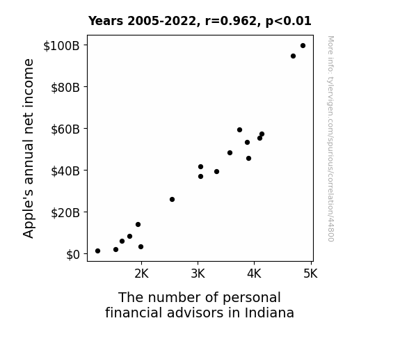 This means 92.6% of the change in the one variable (i.e., The number of personal financial advisors in Indiana) is predictable based on the change in the other (i.e., Apple's annual net income) over the 18 years from 2005 through 2022.