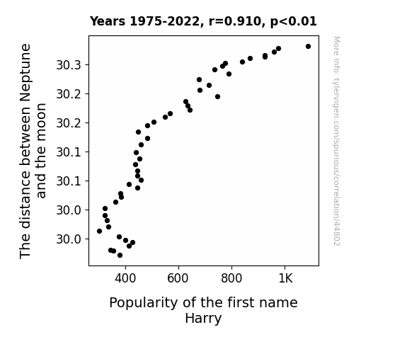 This means 82.8% of the change in the one variable (i.e., Popularity of the first name Harry) is predictable based on the change in the other (i.e., The distance between Neptune and the moon) over the 48 years from 1975 through 2022.