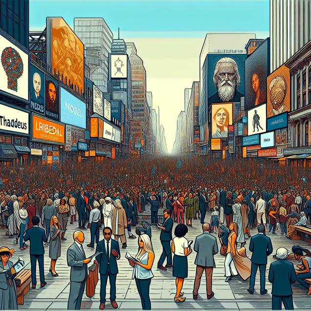 Prompt: Prompt: Generate an image inspired by the meme style, depicting a busy downtown Washington square filled with intellectuals and free-thinkers. Capture the crowd casting their ballots with the name Thaddeus gaining popularity among parents. As the name is whispered, visualize wise philosophers appearing in the scene. Reflect the rising vote count for the Libertarian candidate and the spark of interest in political ideologies. Make the association of Thaddeus with intellectual curiosity and philosophical musings prominent in the image. The depiction should include only scenes, people, and objects, it should not include text or speech bubbles.