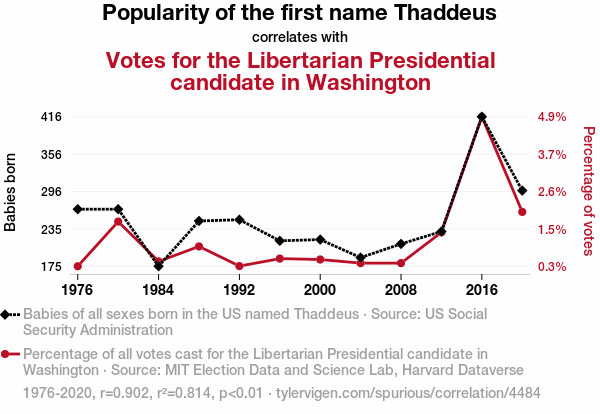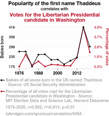 Thaddeus, name popularity, political leanings, Washington State, Libertarian presidential candidate, US Social Security Administration data, MIT Election Data and Science Lab, Harvard Dataverse, correlation coefficient, significance level, statistical analysis, political research, Thaddeus effect, human behavior, name influence, political affiliation, voter behavior