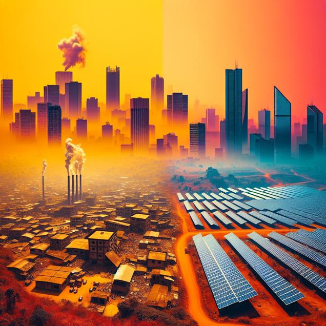 ChatGPT: Generate an image that captures the contrast between the smog-filled city skyline of Duluth and the solar panels in Gabon, utilizing brutalist style. The smog hangs heavily over the city, casting a reddish tint over the landscape. Meanwhile, in Gabon, the intense sunlight is reflected by the smog, allowing the solar panels to capture an unconventional source of energy. The visual should focus on the architectural and environmental elements in both locations, accentuating the brutalist style and the unique interplay of urban and natural elements.