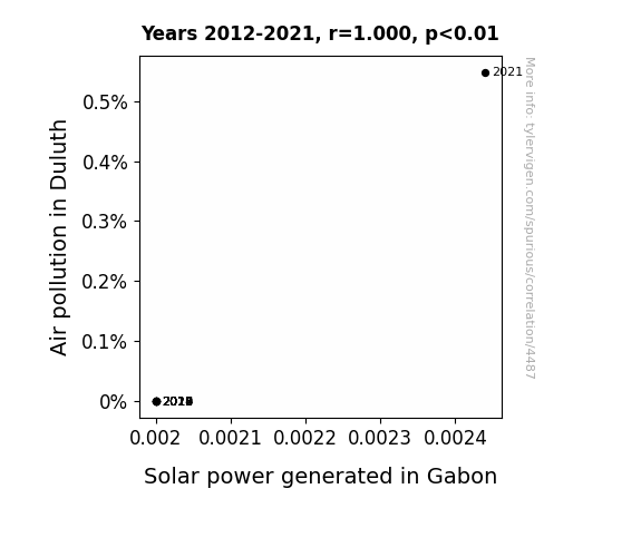 This means 100% of the change in the one variable (i.e., Solar power generated in Gabon) is predictable based on the change in the other (i.e., Air pollution in Duluth) over the 10 years from 2012 through 2021.