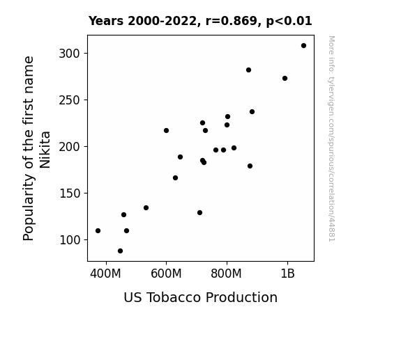 This means 75.5% of the change in the one variable (i.e., US Tobacco Production) is predictable based on the change in the other (i.e., Popularity of the first name Nikita) over the 23 years from 2000 through 2022.