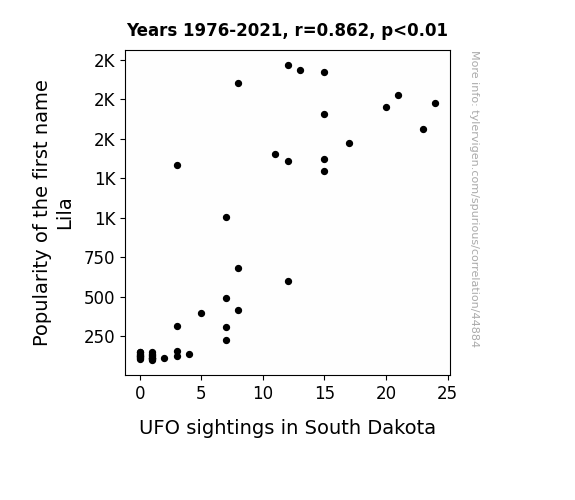 This means 74.3% of the change in the one variable (i.e., UFO sightings in South Dakota) is predictable based on the change in the other (i.e., Popularity of the first name Lila) over the 46 years from 1976 through 2021.