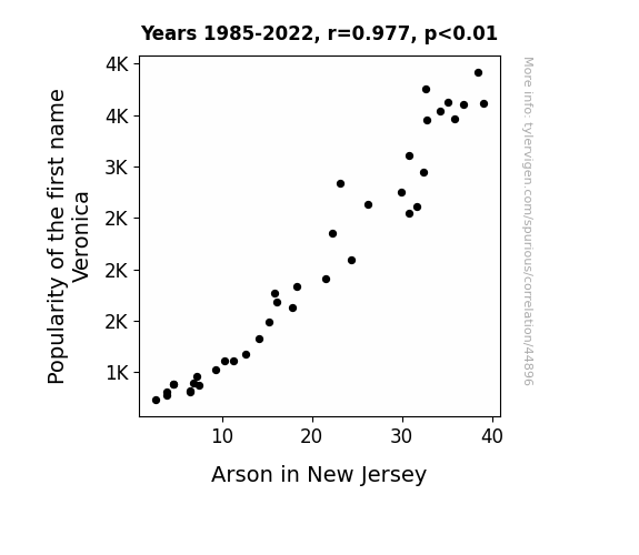 This means 95.4% of the change in the one variable (i.e., Arson in New Jersey) is predictable based on the change in the other (i.e., Popularity of the first name Veronica) over the 38 years from 1985 through 2022.