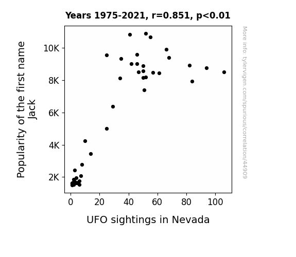 This means 72.5% of the change in the one variable (i.e., UFO sightings in Nevada) is predictable based on the change in the other (i.e., Popularity of the first name Jack) over the 47 years from 1975 through 2021.