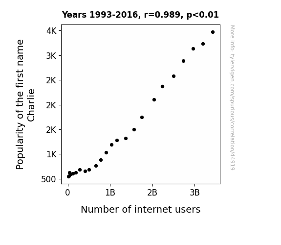 This means 97.8% of the change in the one variable (i.e., Number of internet users) is predictable based on the change in the other (i.e., Popularity of the first name Charlie) over the 24 years from 1993 through 2016.