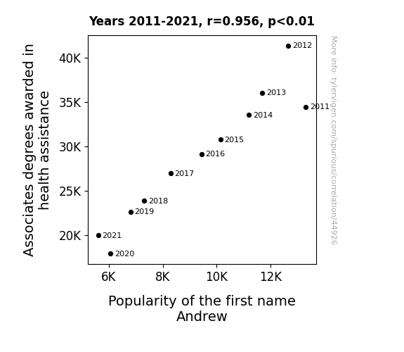 This means 91.4% of the change in the one variable (i.e., Popularity of the first name Andrew) is predictable based on the change in the other (i.e., Associates degrees awarded in health assistance) over the 11 years from 2011 through 2021.