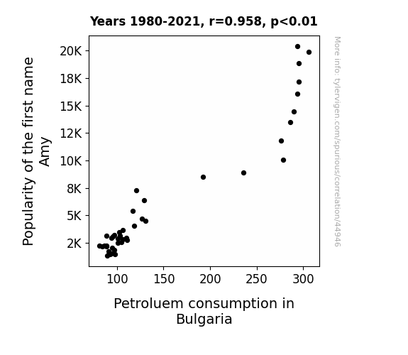 This means 91.7% of the change in the one variable (i.e., Petroluem consumption in Bulgaria) is predictable based on the change in the other (i.e., Popularity of the first name Amy) over the 42 years from 1980 through 2021.