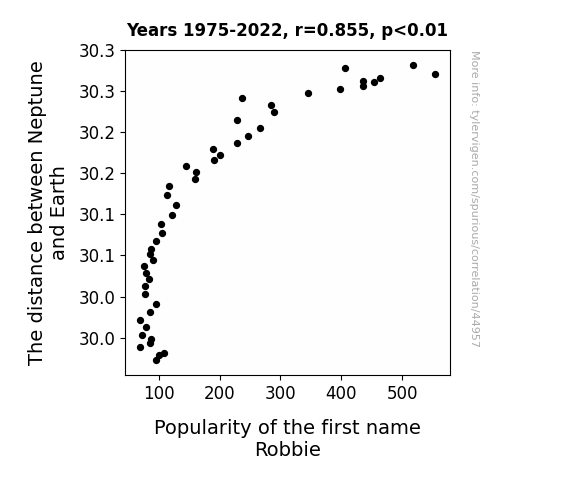 This means 73.1% of the change in the one variable (i.e., Popularity of the first name Robbie) is predictable based on the change in the other (i.e., The distance between Neptune and Earth) over the 48 years from 1975 through 2022.
