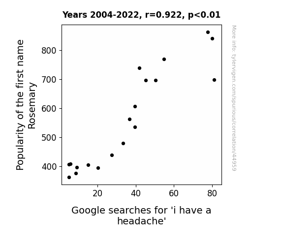 This means 85% of the change in the one variable (i.e., Google searches for 'i have a headache') is predictable based on the change in the other (i.e., Popularity of the first name Rosemary) over the 19 years from 2004 through 2022.