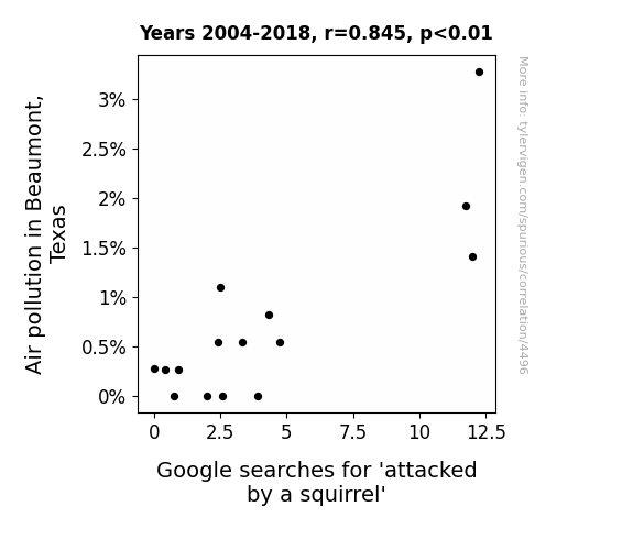 - The spurious research paper: Smoggy Squirrel Scares: Examining the Correlation Between Air Pollution in Beaumont, Texas, and Google Searches for 'Attacked by a Squirrel'