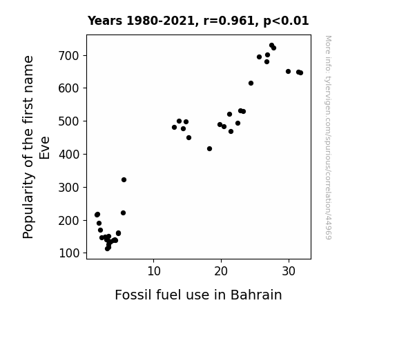 This means 92.3% of the change in the one variable (i.e., Fossil fuel use in Bahrain) is predictable based on the change in the other (i.e., Popularity of the first name Eve) over the 42 years from 1980 through 2021.