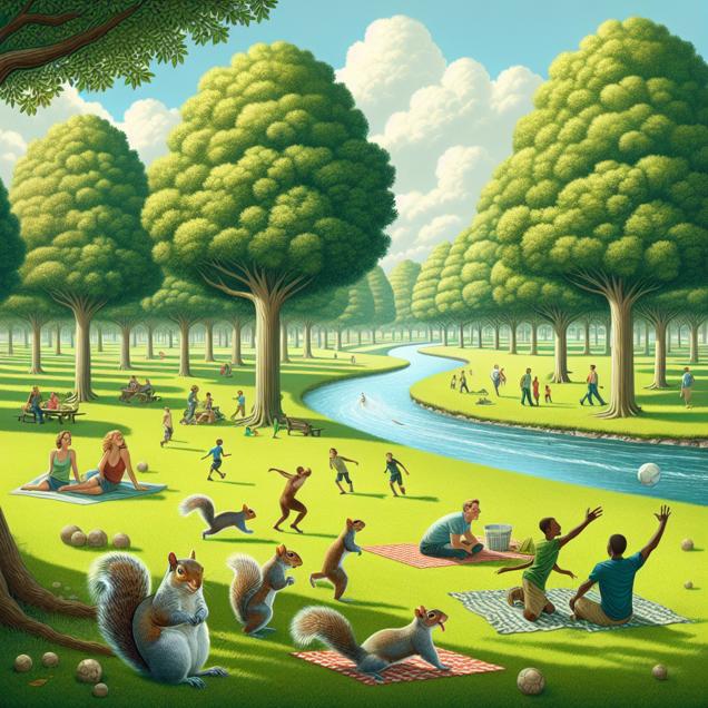 Prompt: Prompt: Generate an image of a serene park scene in Beaumont, Texas, where the air is noticeably cleaner and smokestacks emit less pollution. Show a green landscape with lush trees and a peaceful river flowing. Depict healthy, gleaming squirrels playing peacefully in the park, surrounded by calm and content people. Ensure the overall atmosphere exudes a sense of harmony and coexistence between nature and humans. The depiction should include only scenes, people, and objects, it should not include text or speech bubbles.