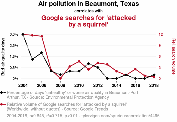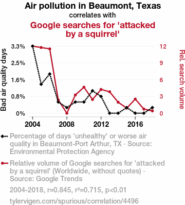 - The spurious research paper: Smoggy Squirrel Scares: Examining the Correlation Between Air Pollution in Beaumont, Texas, and Google Searches for 'Attacked by a Squirrel'
