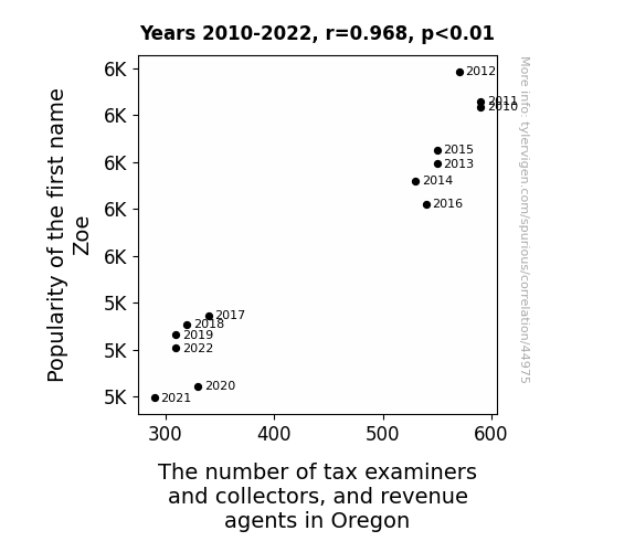 This means 93.6% of the change in the one variable (i.e., The number of tax examiners and collectors, and revenue agents in Oregon) is predictable based on the change in the other (i.e., Popularity of the first name Zoe) over the 13 years from 2010 through 2022.