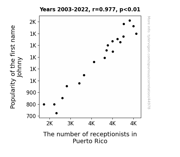 This means 95.5% of the change in the one variable (i.e., The number of receptionists in Puerto Rico) is predictable based on the change in the other (i.e., Popularity of the first name Johnny) over the 20 years from 2003 through 2022.