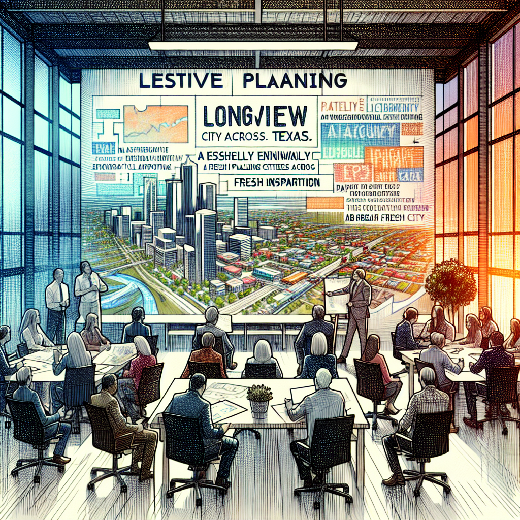 User prompt: Please describe a visual scene that prominently depicts both Air quality in Longview, Texas and The number of urban planners in Texas, in the following situation: As the air quality improved in Longview, Texas, residents found themselves breathing easier. This led to a surge in overall well-being and cognitive function. With clearer minds, more people turned their attention to urban planning, leading to a sudden interest in creating beautifully organized and thoughtfully designed cities across Texas. It's as if the clean air acted as a brainstorming elixir, inspiring a wave of innovative urban development enthusiasts!. Keep the description simple.