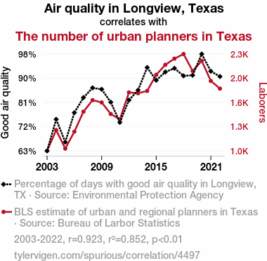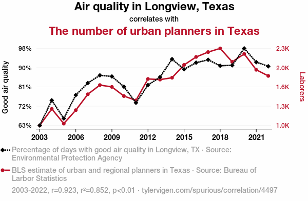 - The spurious research paper: Breath of Fresh Air: Unveiling the Relationship Between Longview, Texas Air Quality and Urban Planners in Texas
