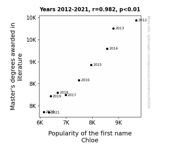 This means 96.5% of the change in the one variable (i.e., Popularity of the first name Chloe) is predictable based on the change in the other (i.e., Master's degrees awarded in literature) over the 10 years from 2012 through 2021.