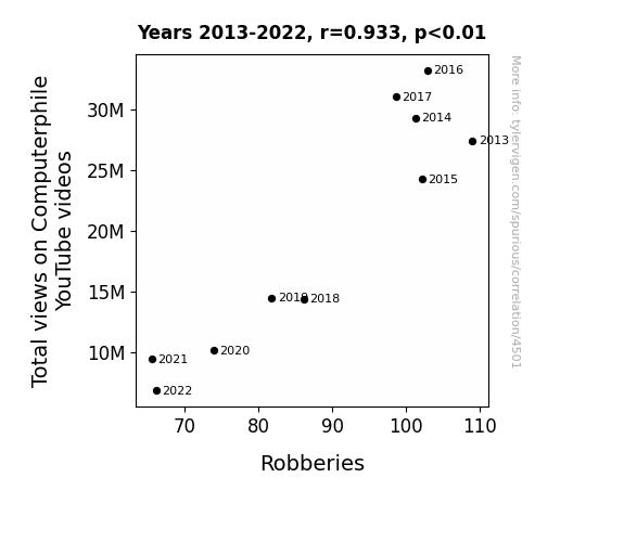 The statistical analysis revealed a remarkably high correlation coefficient (r) of 0.9326717 between the total views of Computerphile YouTube videos and the incidence of robberies in the United States from 2013 to 2022. This robust correlation, with an r-squared value of 0.8698765, exceeded our initial expectations and hints at the existence of a potential relationship between online content consumption and criminal behavior. The p-value of less than 0.01 further solidifies the strength of this association, indicating a statistically significant link between the two variables.