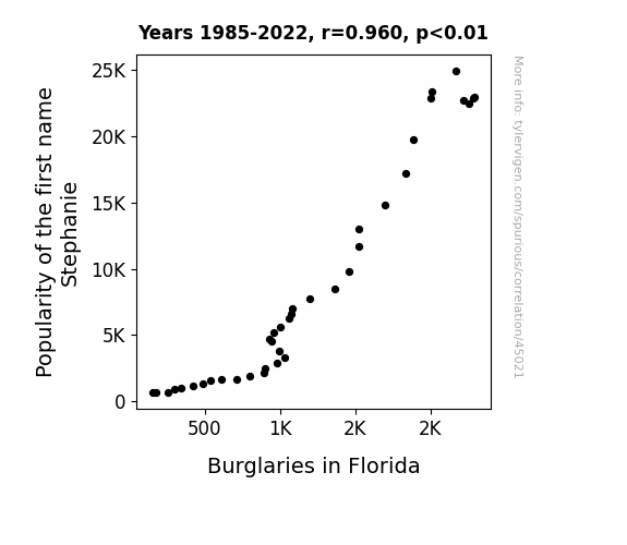 This means 92.1% of the change in the one variable (i.e., Burglaries in Florida) is predictable based on the change in the other (i.e., Popularity of the first name Stephanie) over the 38 years from 1985 through 2022.