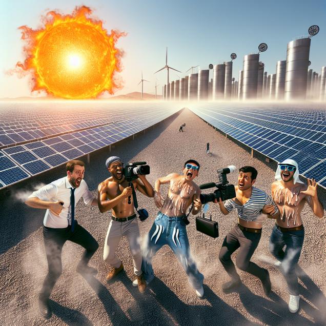 User prompt: Please respond with an image generation prompt that would be likely to create an interesting visual using DALLE-3, using the following style: [ A funny image you would see on reddit ] and depicting this scene: Underneath the scorching Kuwaiti sun, rows of solar panels stretch into the distance, their gleaming surfaces reflecting the intense light. Amidst the heat, the MrBeast team huddles together, brainstorming clickbait video titles as they wipe sweat from their brows. The combination of relentless solar power and relentlessly provocative video ideas creates a sizzling atmosphere of renewable energy and over-the-top thumbnails. Keep the visual depiction simple. Do not include any words or speech bubbles.