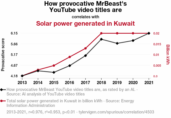 User prompt: Please make up a funny explanation for how an increase in How provocative MrBeast YouTube video titles are caused Solar power generated in Kuwait to increase. Add a funny one-liner at the end.
