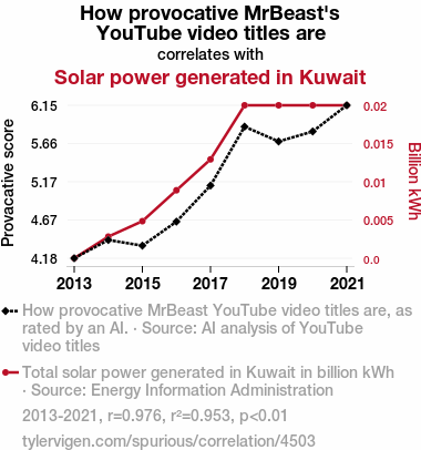 This means 95.3% of the change in the one variable (i.e., Solar power generated in Kuwait) is predictable based on the change in the other (i.e., How provocative MrBeast's YouTube video titles are) over the 9 years from 2013 through 2021.