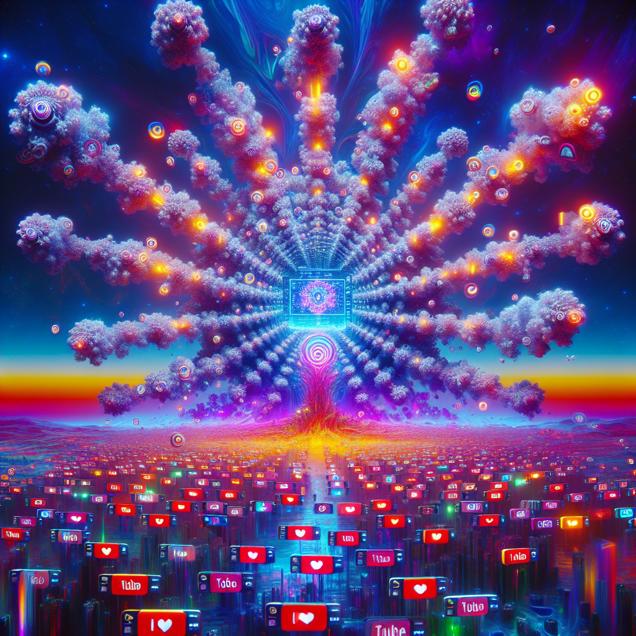 ChatGPT: Prompt: Generate an image of a mesmerizing, surreal digital landscape reminiscent of Vaporwave, featuring a YouTube comment section filled with a series of Numberphile videos. The name "Hanna" appears repeatedly, igniting a cascade of comments and replies. The screen is a captivating web of comments creating a fractal-like pattern, pulsing and expanding with each mention of the name "Hanna." The vibrant discussions on mathematical concepts seem to multiply exponentially, as if the name itself has a magical formula that multiplies the comments. The scene should evoke a sense of digital transcendence and psychedelic aesthetics, with neon colors, digital glitches, and a dreamy, otherworldly atmosphere.