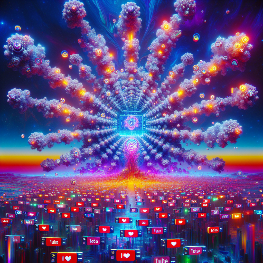 Prompt: Prompt: Generate an image of a mesmerizing, surreal digital landscape reminiscent of Vaporwave, featuring a YouTube comment section filled with a series of Numberphile videos. The name "Hanna" appears repeatedly, igniting a cascade of comments and replies. The screen is a captivating web of comments creating a fractal-like pattern, pulsing and expanding with each mention of the name "Hanna." The vibrant discussions on mathematical concepts seem to multiply exponentially, as if the name itself has a magical formula that multiplies the comments. The scene should evoke a sense of digital transcendence and psychedelic aesthetics, with neon colors, digital glitches, and a dreamy, otherworldly atmosphere. The depiction should include only scenes, people, and objects, it should not include text or speech bubbles.