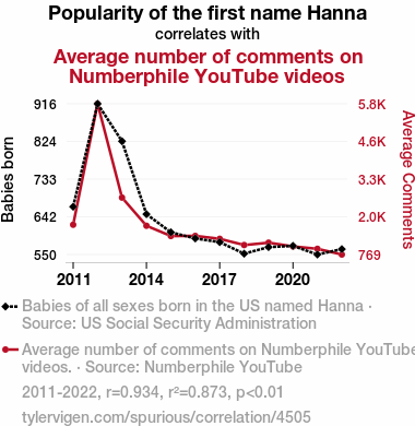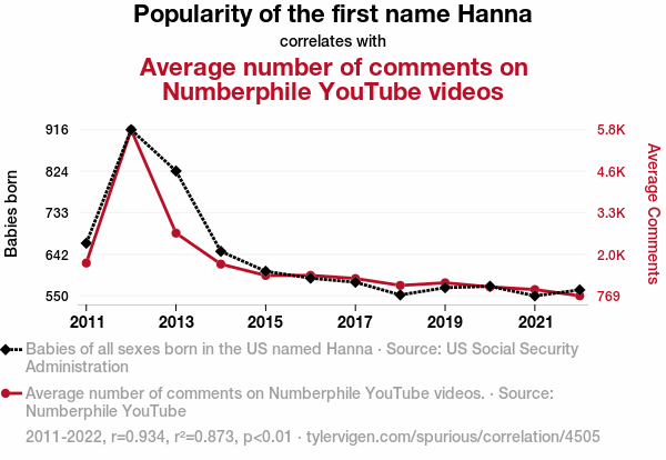 - The spurious research paper: Hanna Hilarity: Exploring the Correlation between the Popularity of the Name Hanna and the Average Number of Comments on Numberphile YouTube Videos