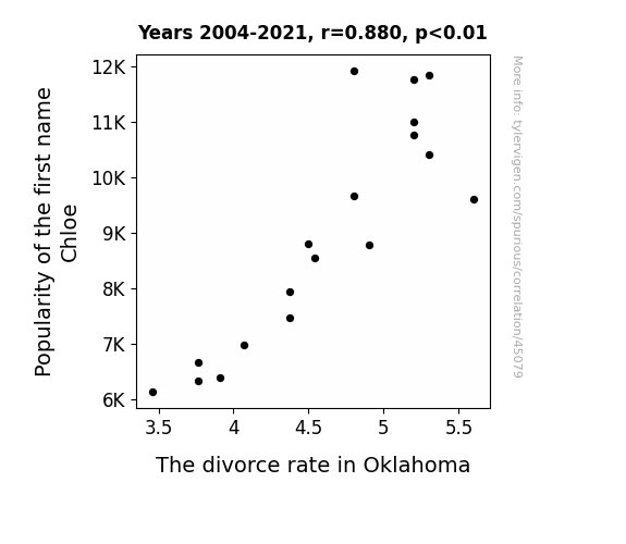 This means 77.4% of the change in the one variable (i.e., The divorce rate in Oklahoma) is predictable based on the change in the other (i.e., Popularity of the first name Chloe) over the 18 years from 2004 through 2021.